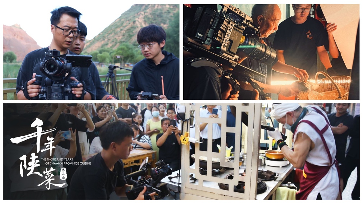 图注:上左:剧组在陕北拍摄;上右:拍摄现场,三原白封肉;下:拍摄现场,延安二道街夜市