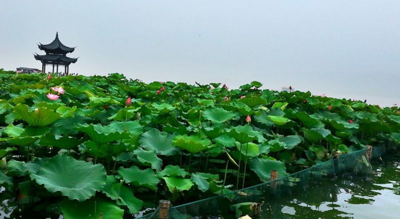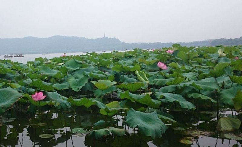 i stood on the famous historical duanqiao bridge, overlooking the quiet lake, its embankment and the dike shadow reflected in the water. the vocabularies used to describe west lake and the fine scenery can be no more perfect than the words once used by xu zhimo: "delicate and pretty as well as comely”, for west lake is really an ideal and rare beauty. the moon has risen, and its round full body floods its bright light on the lake. i remember that xu zhimo and hu shi would "take a boat to play in the moonlight" on the lake. they, on a little boat, which was as light as an autumn leaf, they quietly slipped over the soft chest of the lake at night. with a small oar, which was as light as a reed stalk, they gently patted her smooth, tender and sweet skin. the two drunk literati intended to prick her dream-like fog shell, to be secretly intimate with her, and try to share her interest in appreciating the moonlight. i have come here too, but i am not keen on being intimate with the beauty right now, i just want to enjoy the lotus pond, for the lotus are her lovely skirt. "clouds would dress like yung clothes and flowers want good looks", i believe the girl of west lake, in her rich attire will be even more glamorous and elegant.
