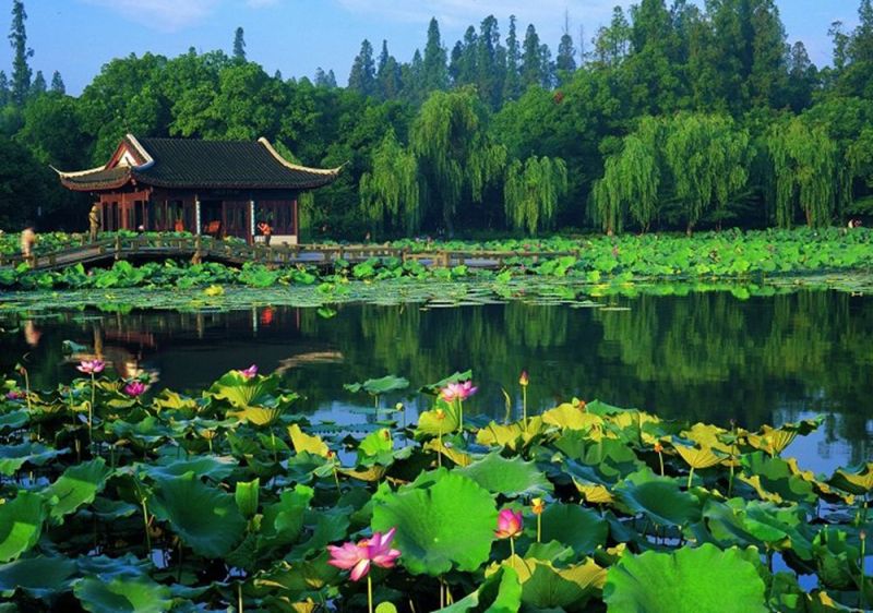 the moon gradually sinks into the bottom of the lake, but i still cannot bear to leave. it seems to be reluctant to part with the lotus pond and me. on such a date, time flies before one knows it. until the red sun rises, i find that the sunlight through the duanqiao bridge’s arch is reflected in the water, and the surface of west lake becomes blonde and sparkly. while the ten kilometer of the lotus pond are bathed in the golden sunlight, the green lotus leaves seem connected to the sky, surrounding the shore, the bridge, the green mountains and a pagoda. how splendid a giant painting of a lotus pond it is, it is as if an emerald is embedded in the west lake. the lotus pond is the beautiful skirt of west lake, and with it the lake looks more charming……