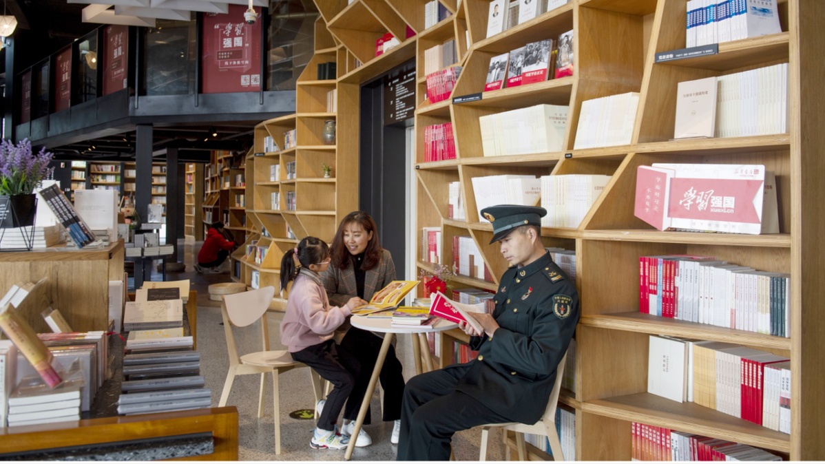 (图为俞细文与妻子女儿到驻地新华书店看书学习。刘明松摄)
