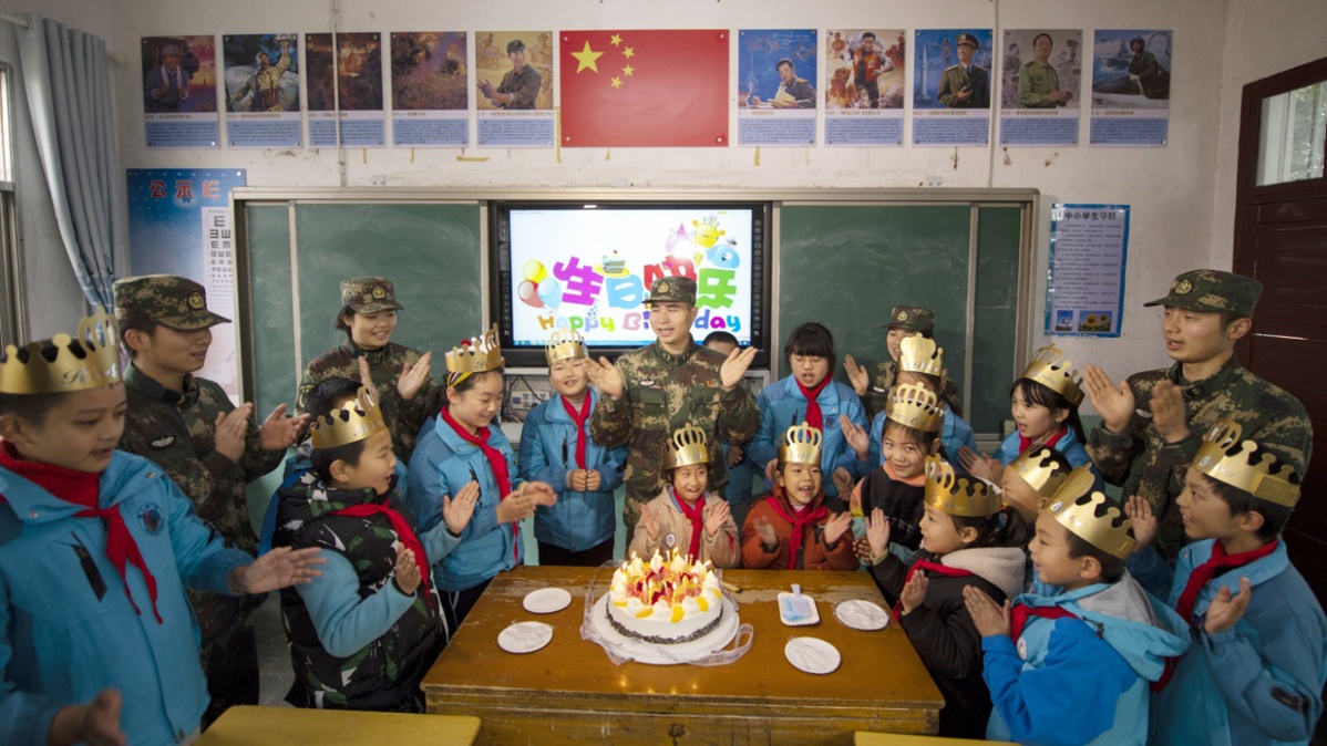 (图为俞细文正在为驻地留守小学生过集体生日。刘明松摄)